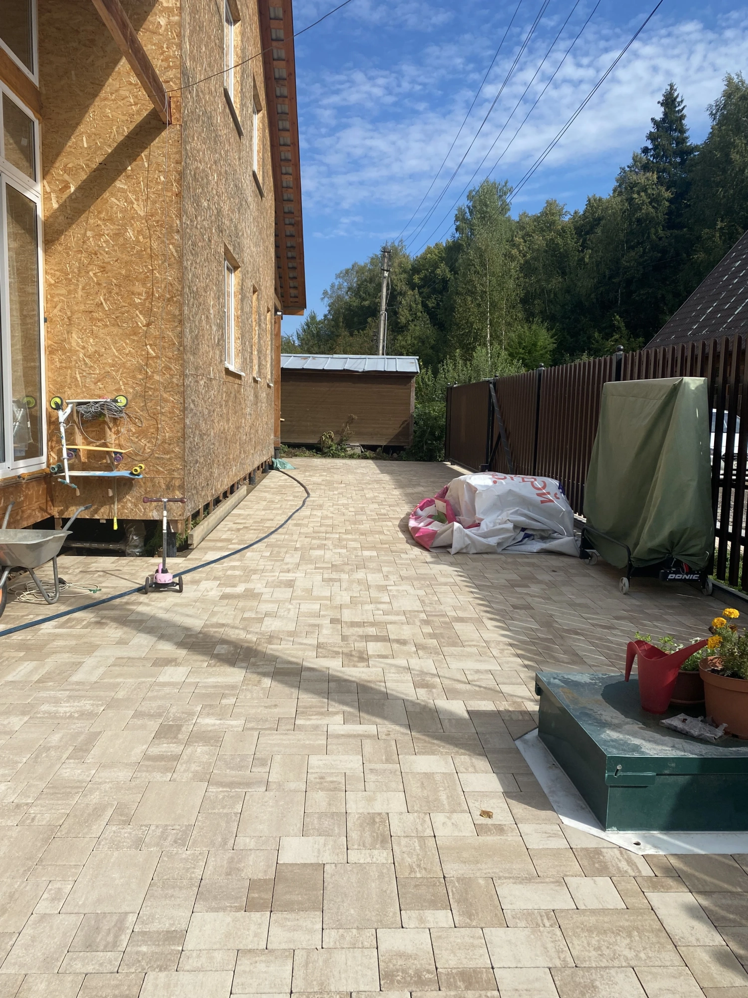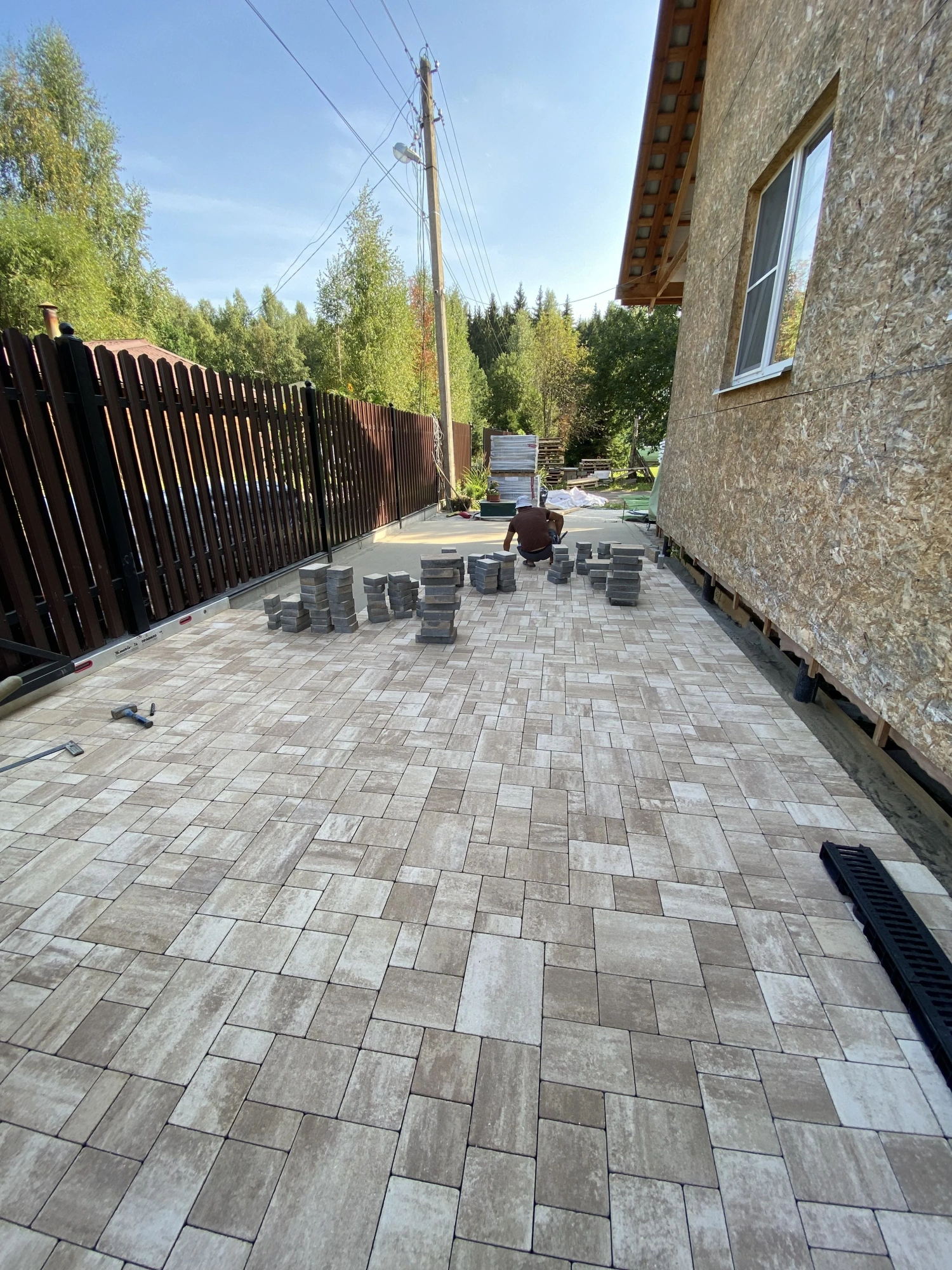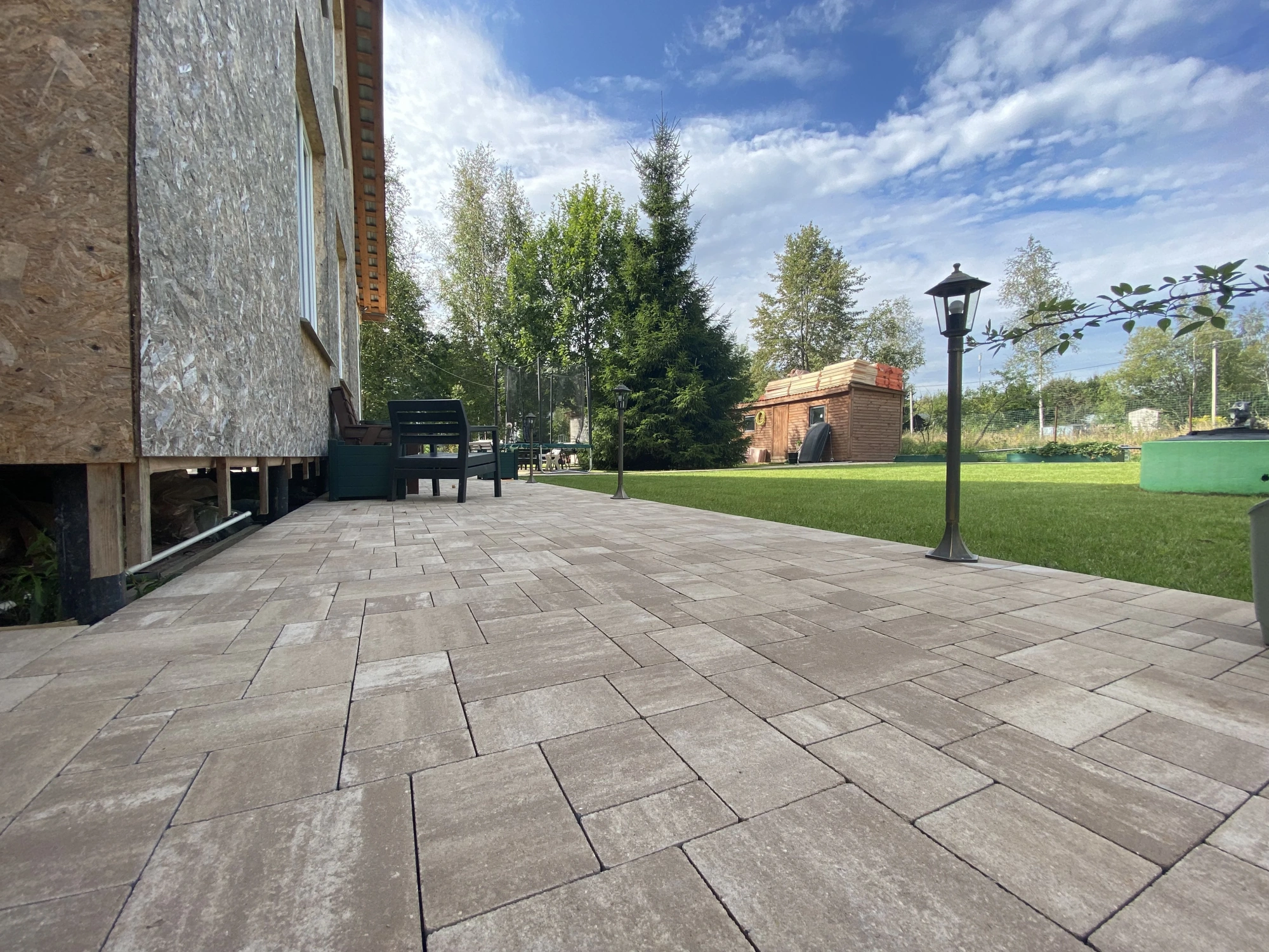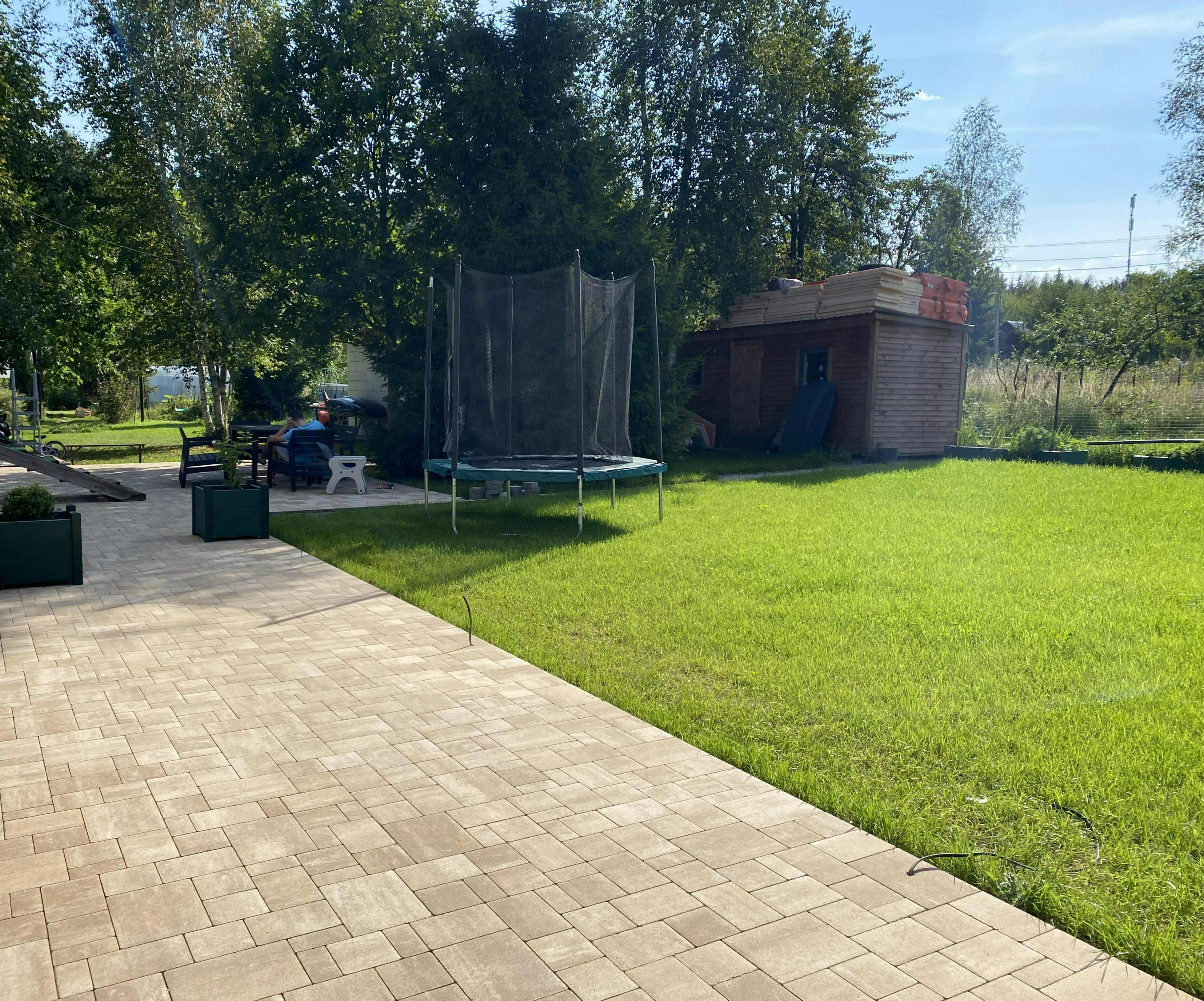 При разработке дизайна обшивки дома возникла необходимость в использовании светлого материала для мощения. Идеальным решением стала тротуарная плитка от производителя Steingot формы Бавария цвета "Травертин".