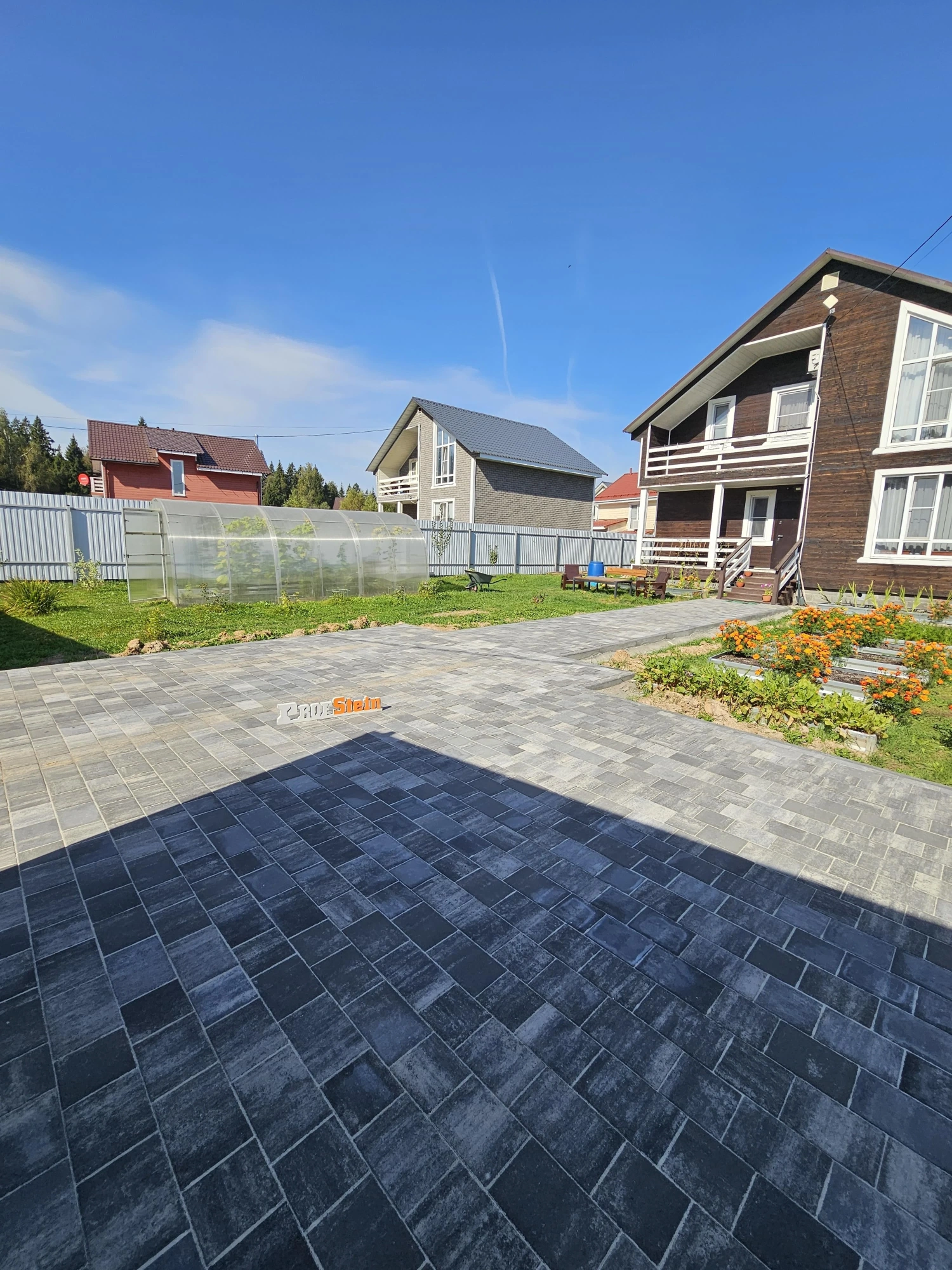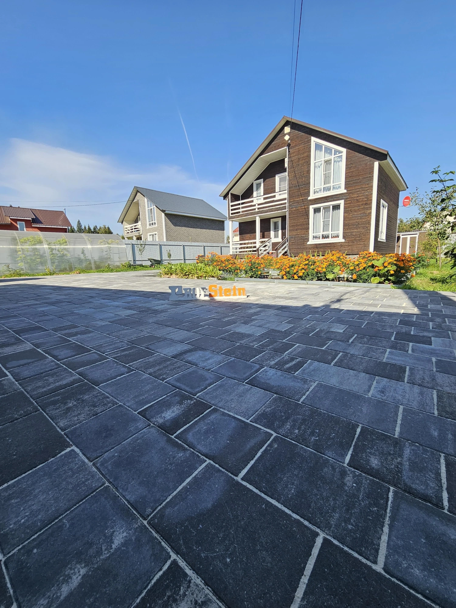 Мы выполнили работы по мощению территории площадью 85 квадратных метров, используя качественную тротуарную плитку от Steingot формы Новый город в интересном оттенке "Штайн Блэк". Этот цвет с теплым коричневым подтоном был специально подобран, чтобы создать гармоничный ансамбль с фасадом дома.
