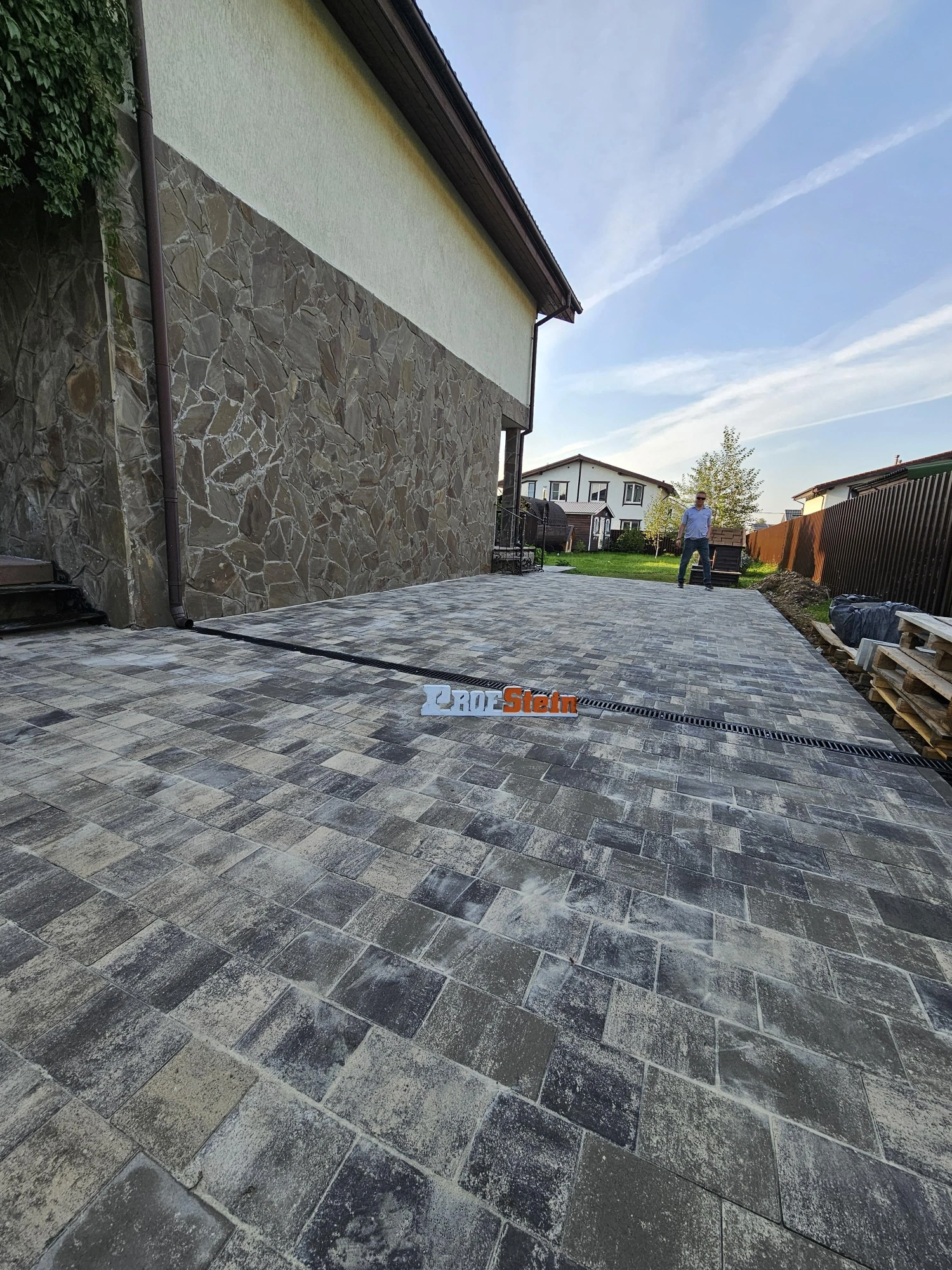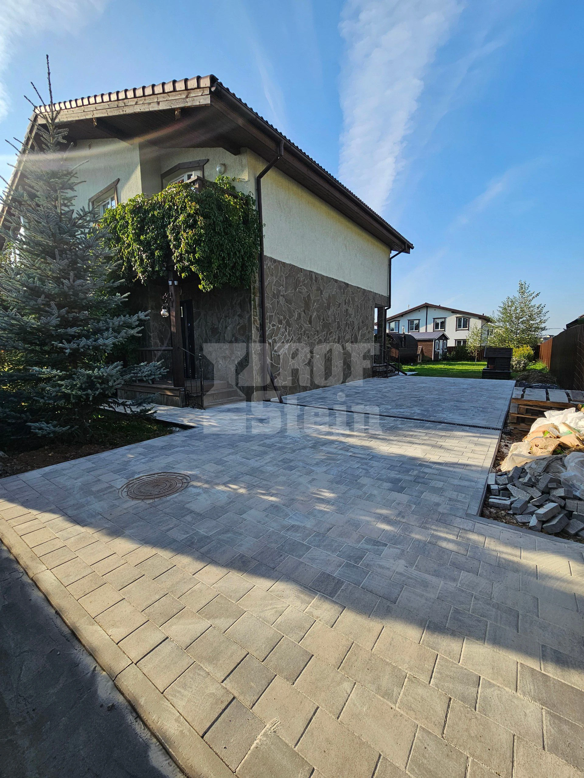 В результате получилось ровное, стильное и долговечное мощение, которое прекрасно сочетается с архитектурой дома. Но главное - все работы выполнены профессионально и с гарантией качества!