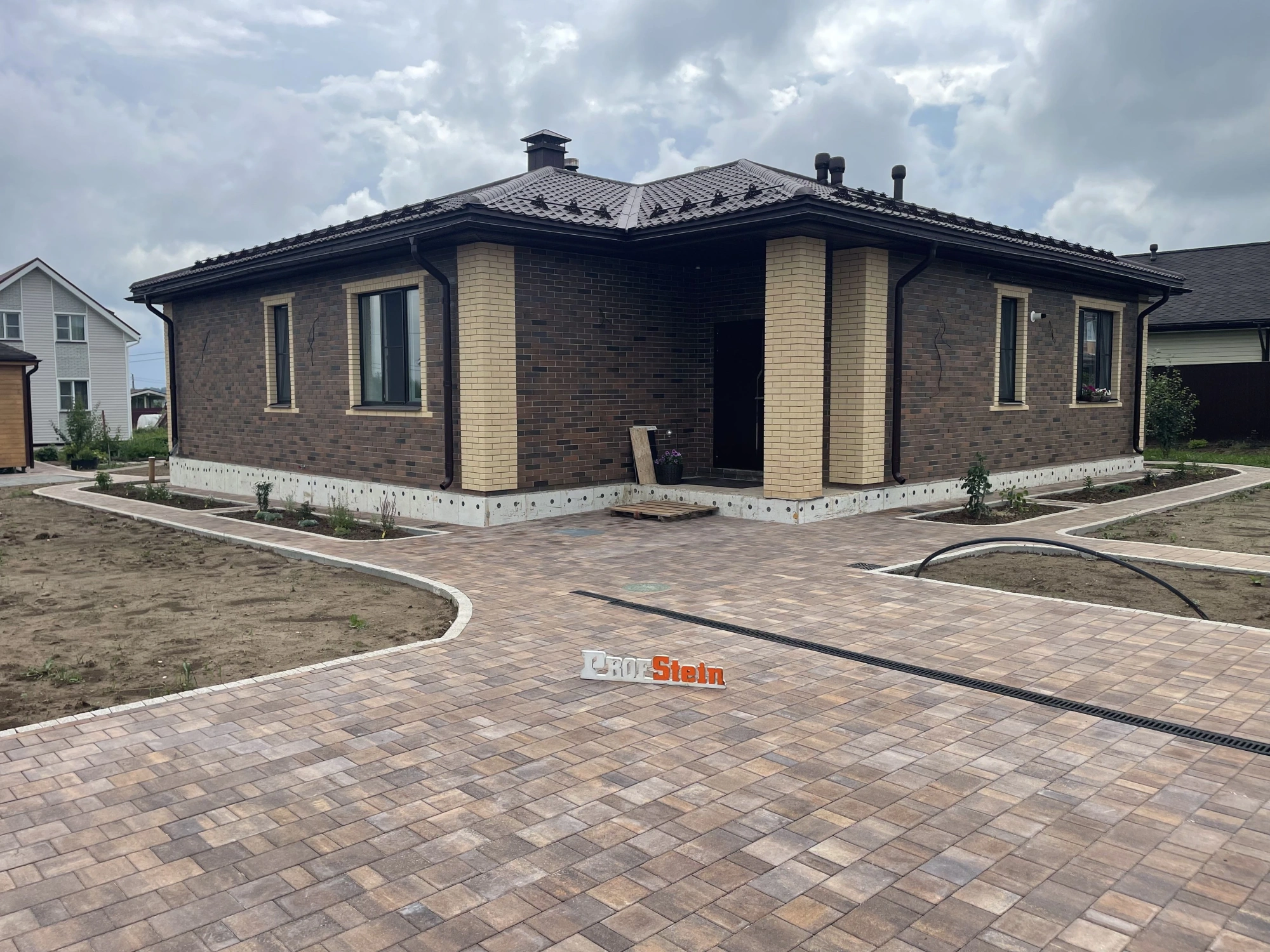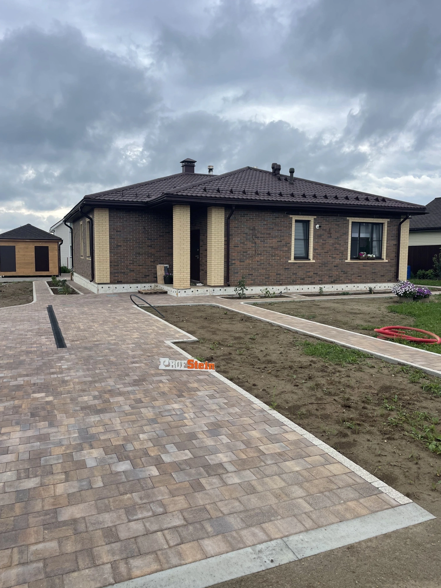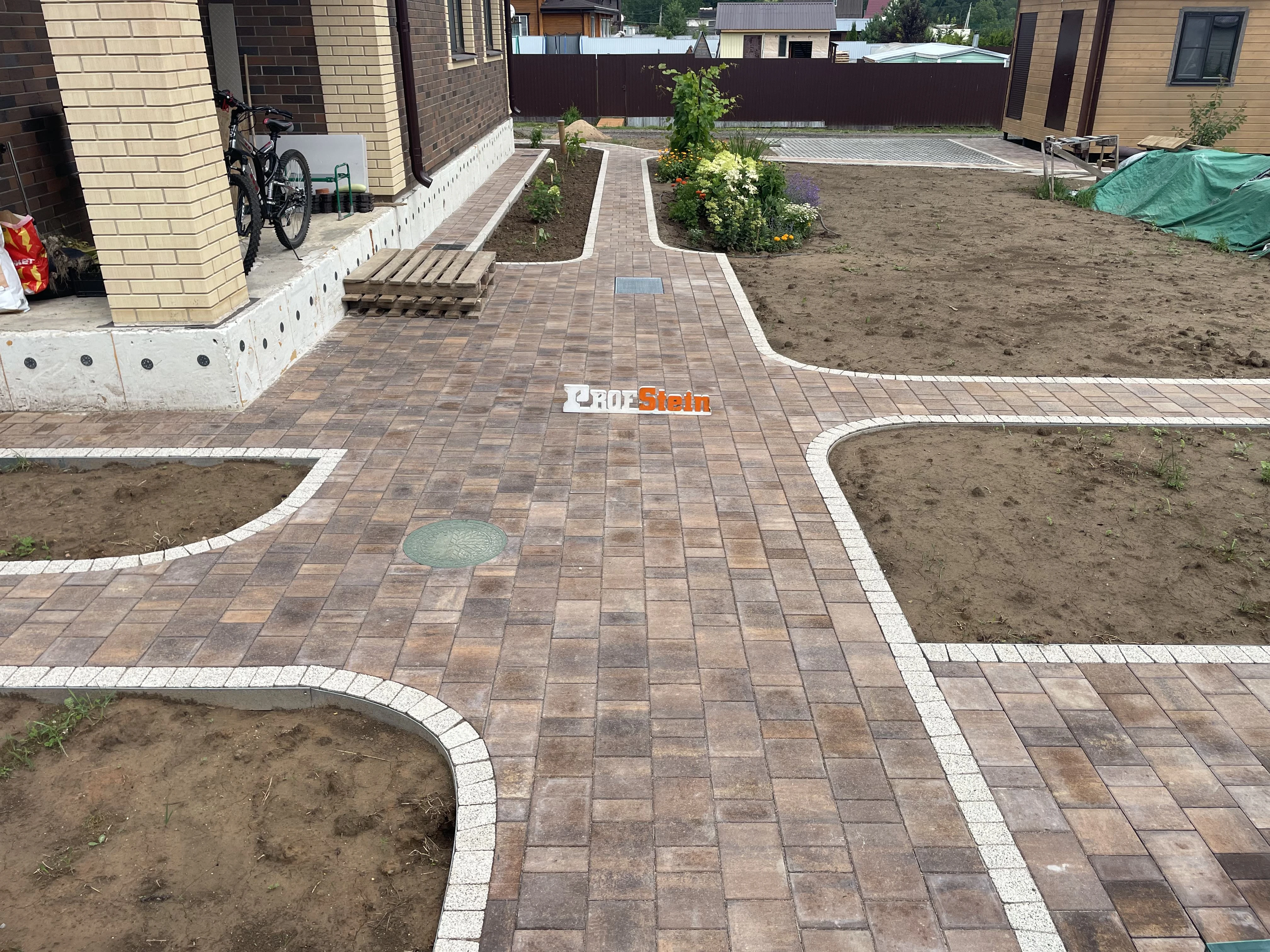 Центральным элементом проекта стала укладка 224,5 м² тротуарной плитки от Braer формы Старый город Ландхаус в цвете "Каштан", дополненной 64 пошаговыми плитами для удобного перемещения по участку. Особое внимание уделили функциональности: установили 271 метр оцинкованного бордюра, проложили 20 метров дренажной системы и смонтировали 7 дождеприемников с водосточным лотком для эффективного отвода осадков.