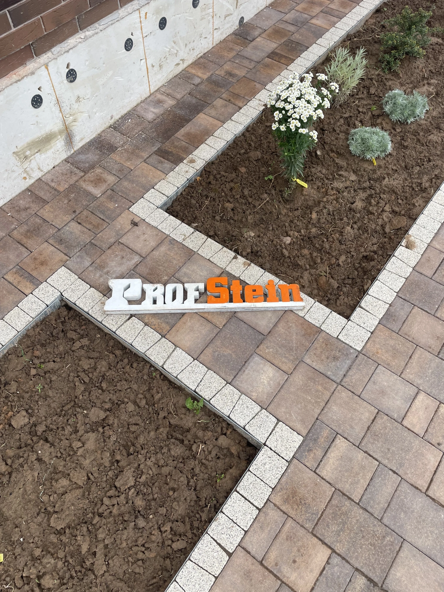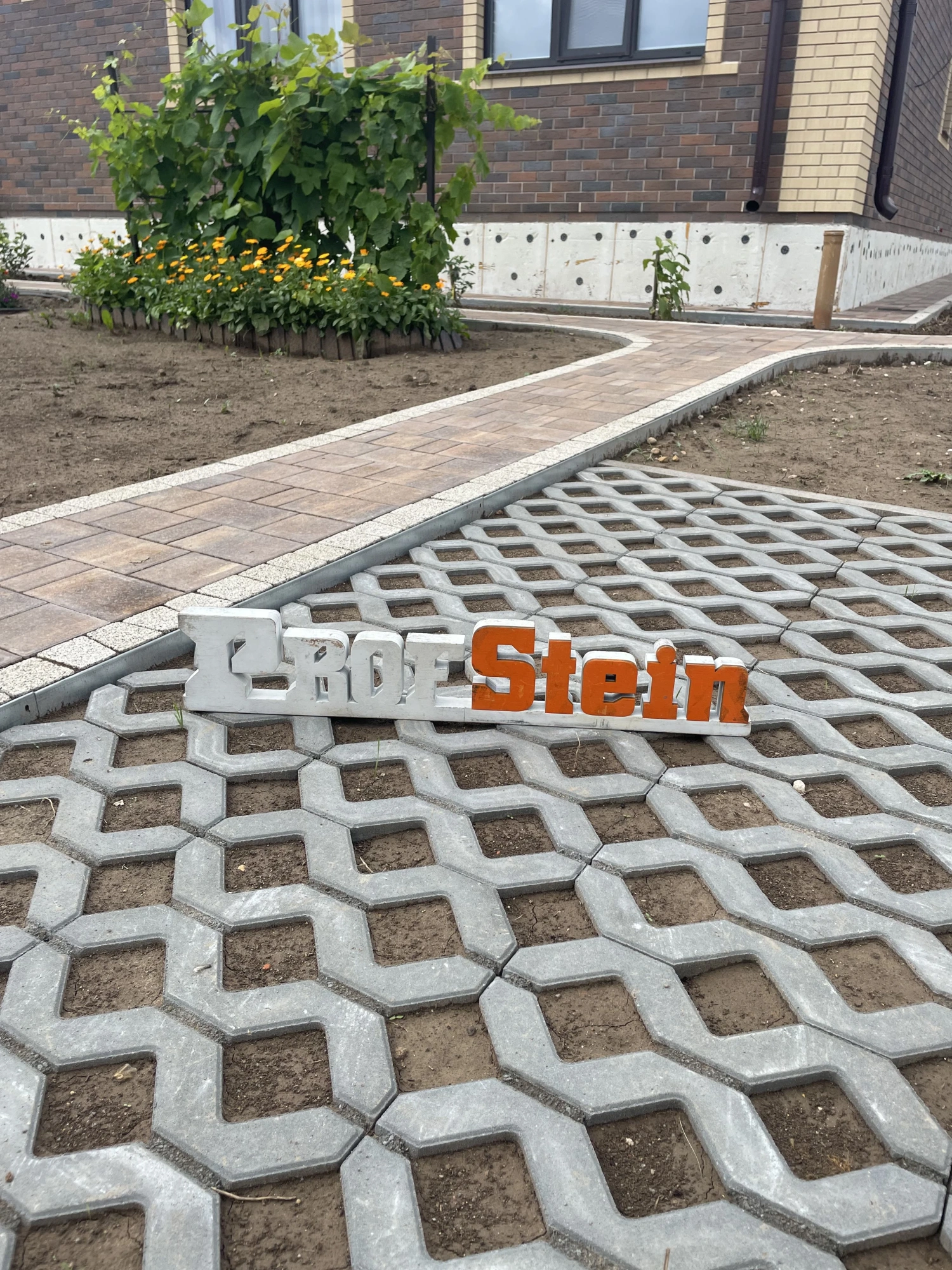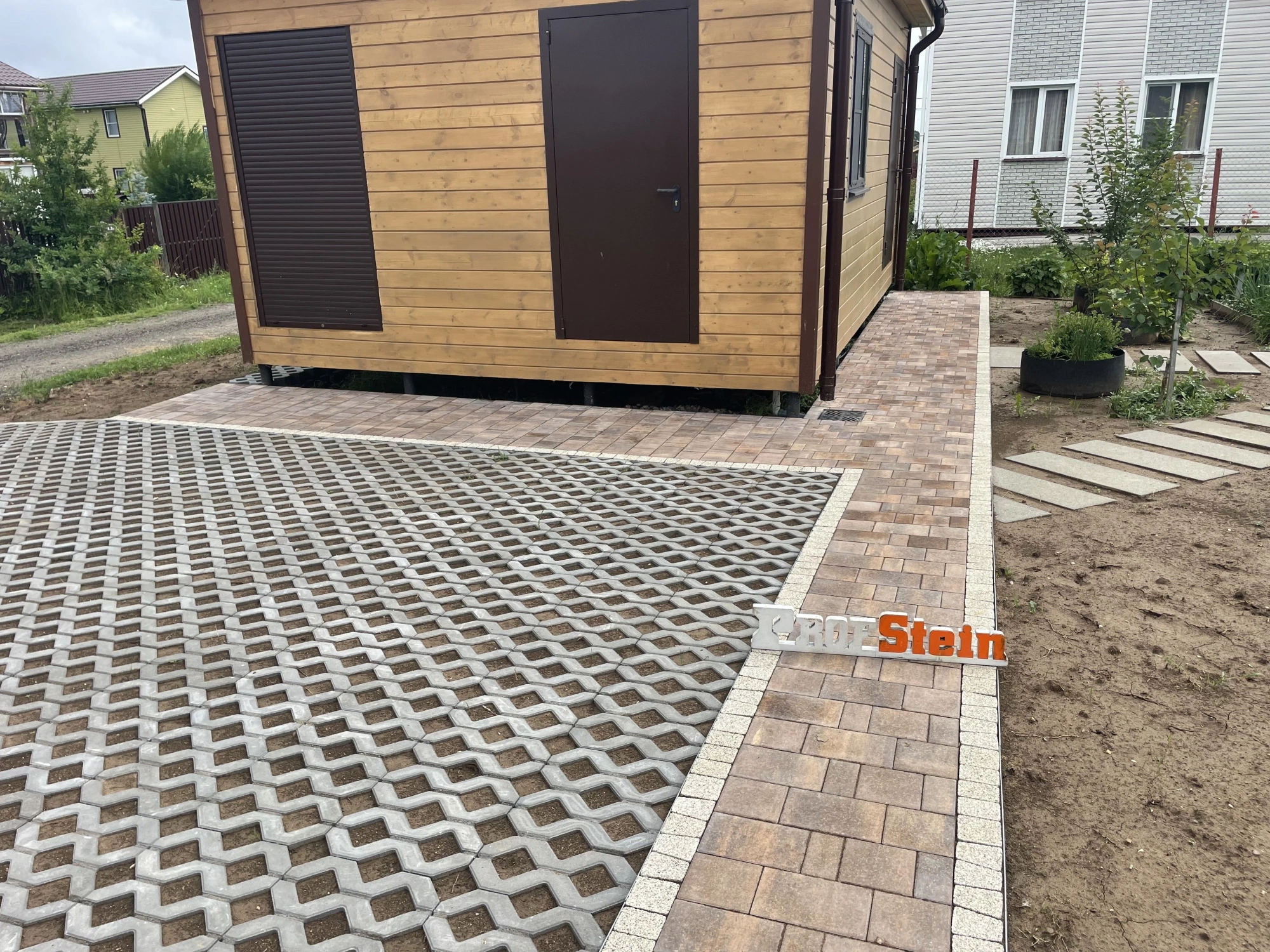 Центральным элементом проекта стала укладка 224,5 м² тротуарной плитки от Braer формы Старый город Ландхаус в цвете "Каштан", дополненной 64 пошаговыми плитами для удобного перемещения по участку. Особое внимание уделили функциональности: установили 271 метр оцинкованного бордюра, проложили 20 метров дренажной системы и смонтировали 7 дождеприемников с водосточным лотком для эффективного отвода осадков.