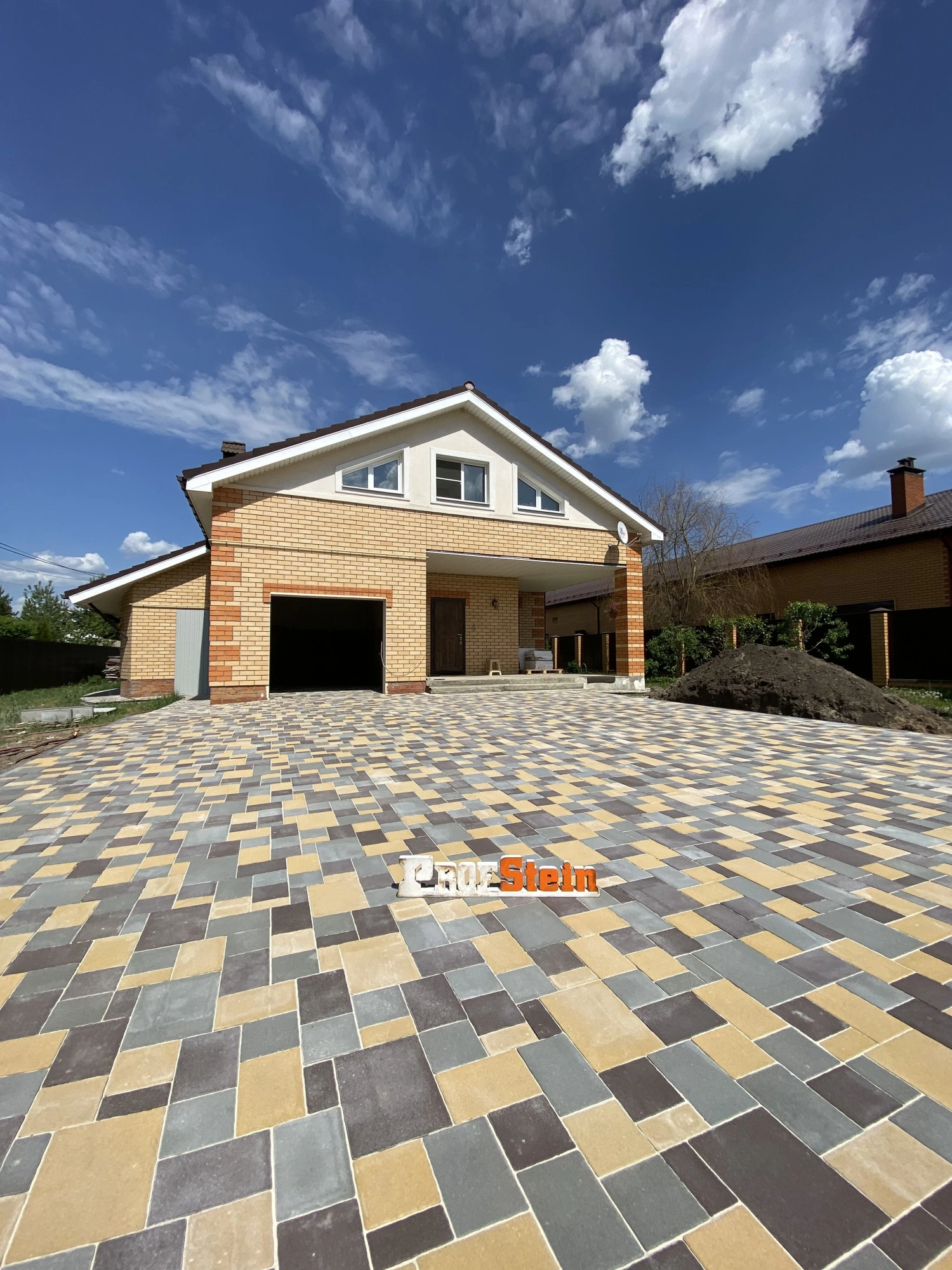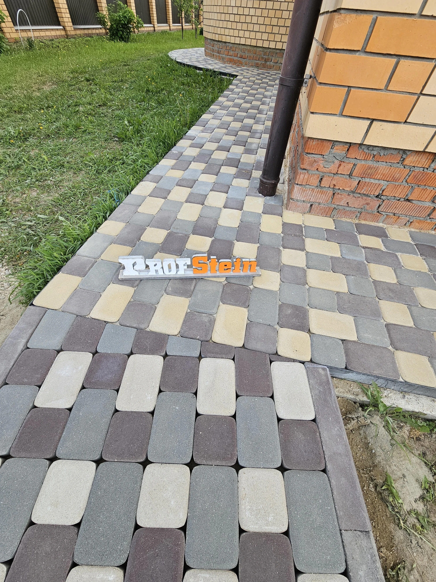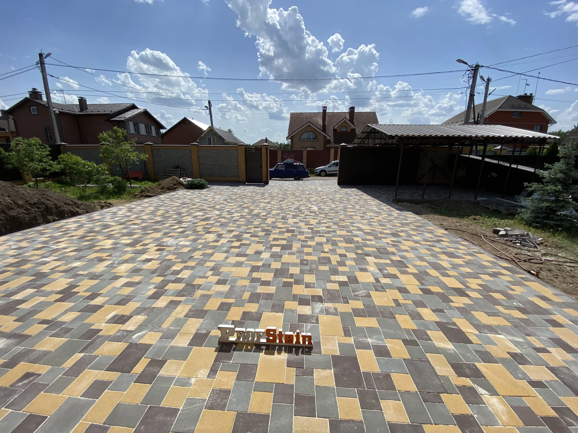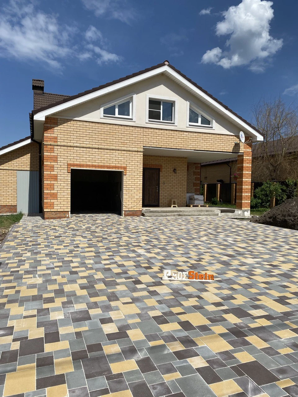 Нюанс заключался в том, что плитка была представлена в четырех размерах и трех цветах. Для правильной укладки необходимо следовать раскладке, предоставленной производителем. Наши мастера приложили максимум усилий, подбирая цвета таким образом, чтобы ближе к дому был преобладающий желтый оттенок, а у забора — коричневые тона, при этом строго следуя чертежу раскладки и не оставляя лишних элементов. Мы справились с этой задачей на все 100%.